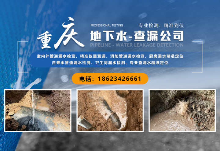 电话18623426661 主要承接业务有:重庆漏水检测,室内外管道漏水检测,专业查漏水,精准仪器测漏,消防管道漏水检测,厨房漏水精准定位,重庆自来水管道漏水检测,卫生间漏水检测,专业查漏水精准定位,拥有先进的进口仪器专业测漏,公司拥有一支技术能力强,能打硬仗,肯吃苦耐劳,经验丰富的查漏队伍。配备了先进的漏水检测设备和探测手段,长期致力于地下管道的漏水探测,良好的探测技术和服务质量,其拥有管线仪、听漏仪、相关仪、气漏仪等多种先进的检漏设备和检漏技术过硬、责任心强、经验丰富的漏水检测专业技术人员,通过先进的技术手段,在非开挖的情况下,迅速、准确的探测出、查找出埋在地下水管的漏水点位置。在最短的时间内,花最少的钱,解决供水管网存在的漏水问题,减少水费的开支。 专业检测管道服务公司,专业从事地下压力管道破损检测服务。包括地下自来水管漏水检测、 消防水管漏水检测,压力管道安装维修等,主动开展管网检漏工作是降低管道漏损的重要途径。